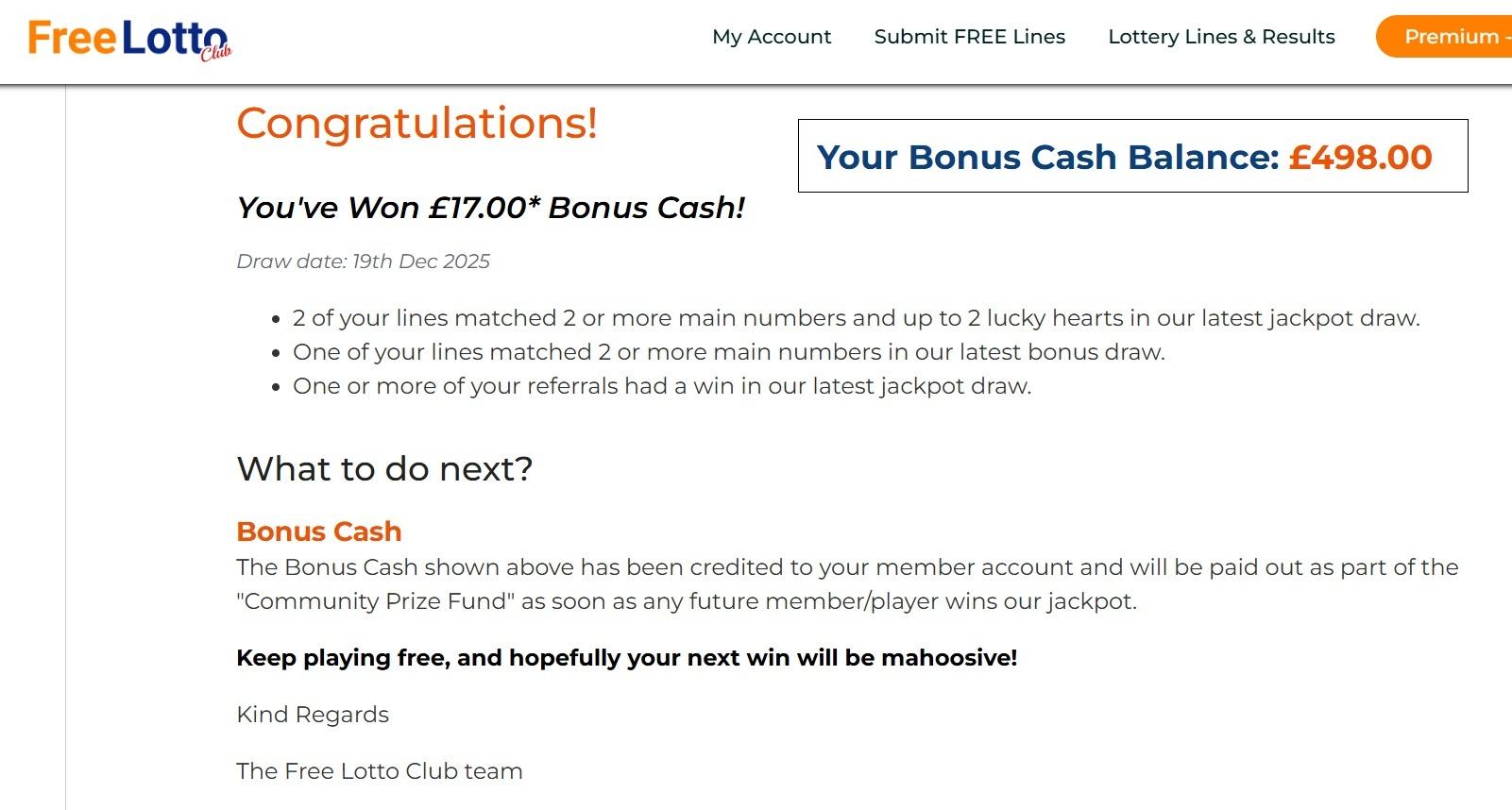 • And again I won a prize in the weekly draw of the FREE Lotto. This week I won £17.00 so my total Bonus Cash Balance is now £498.00.