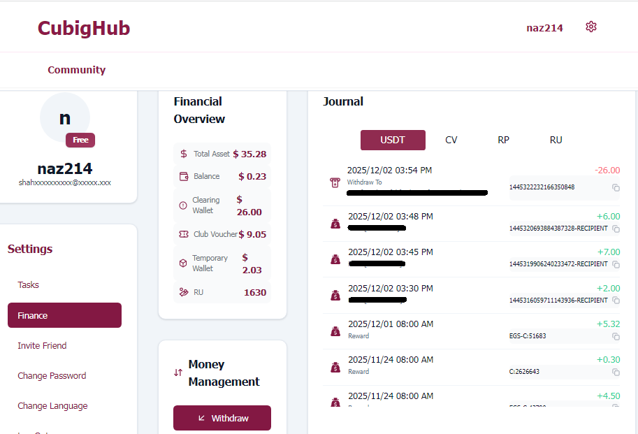• This is my next withdrawal ($26.00) from CubigHub.com without any investment.
