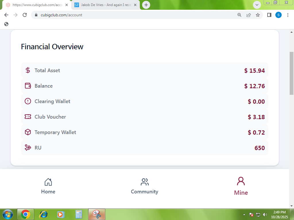 I earned $12.76 USDT (temporary wallet is 0.72) in Cubig. Just for watching daily Google Ads on the site. You can do this too. Check all info on my site: Signup here: https://www.cubigclub.com/register?dt=73703d6e617a323134