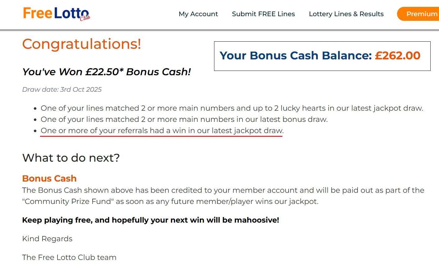 Submit daily 5 FREE lines. You can upgrade to Premium member, just like I did, to receive also all winnings of your referrals.